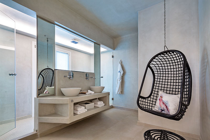 Κάθε σουίτα διαθέτει διαφορετικό design, ενώ το κόκκινο χρώμα, το χρώμα σήμα κατατεθέν του ξενοδοχείου, κυριαρχεί και στις ιδιωτικές πισίνες και στα jacuzzi, που σχεδόν όλα τα δωμάτια διαθέτουν.
