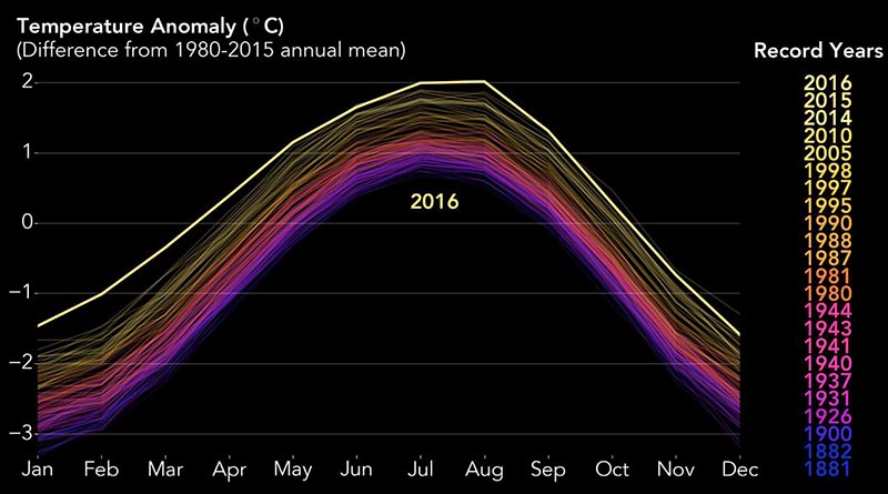Στην πραγματικότητα, το 2016 σηματοδοτεί το τρίτο συνεχόμενο έτος με ρεκόρ ζέστης για τον κόσμο μετά το 2014 και το 2015. Ο κάθε μήνας από τον Ιανουάριο έως τον Αύγουστο γινόταν με την σειρά του ο θερμότερος μήνας που είχε καταγραφεί.