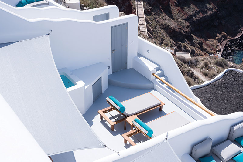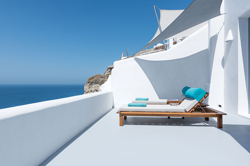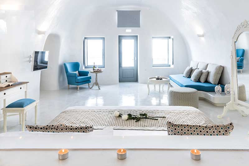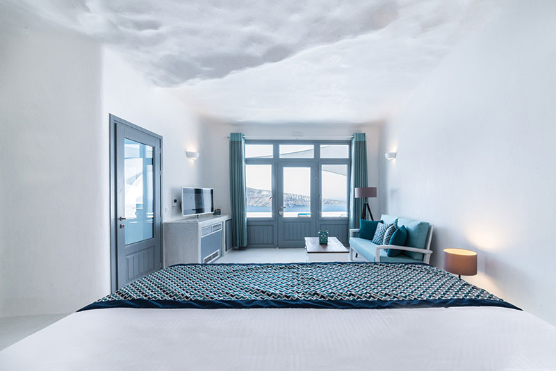 Από κάθε άνοιγμα του ξενοδοχείου, είτε πόρτα, είτε παράθυρο, είναι άμεση η θέαση προς το ηλιοβασίλεμα και την Καλντέρα. Τα ειδυλλιακά σκηνικά συμπληρώνουν την λεπτή αισθητική της κάθε σουίτας και δίνουν έμπνευση για την επικράτηση της μεσογειακής ατμόσφαιρας.