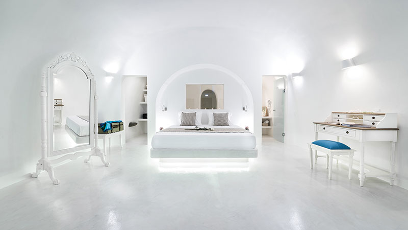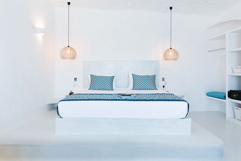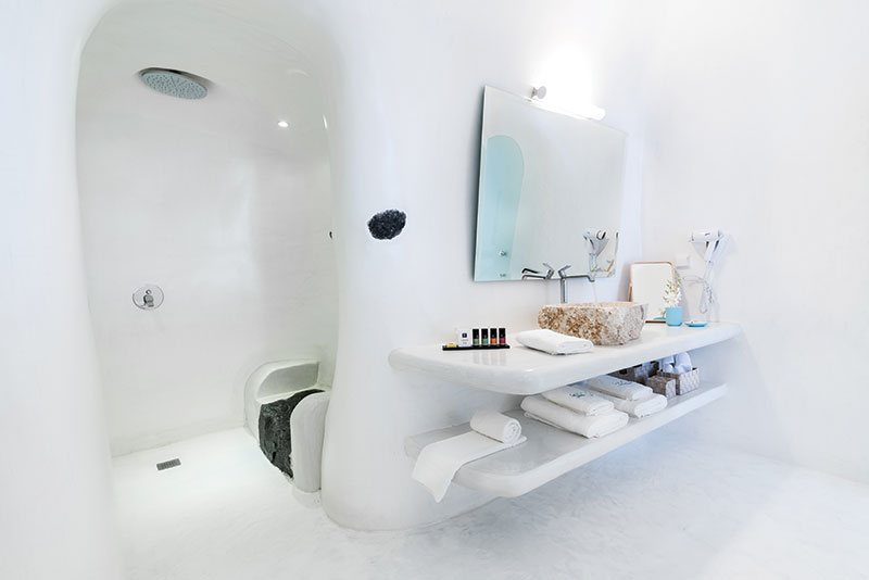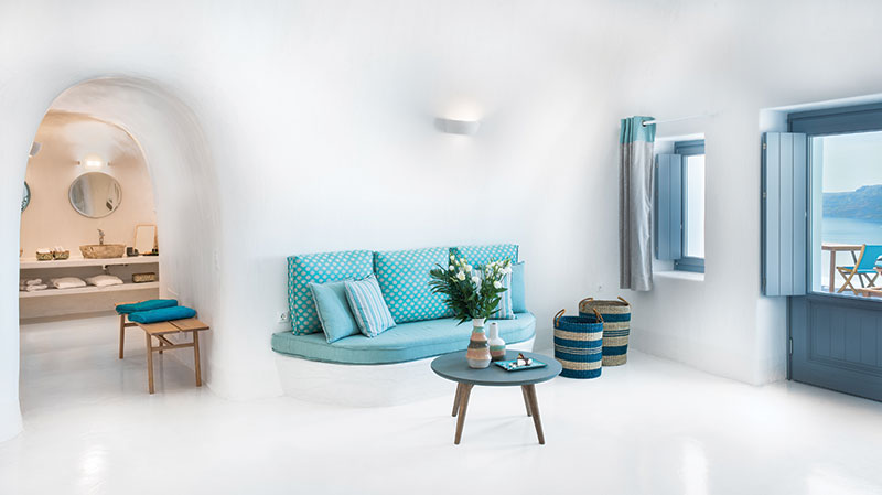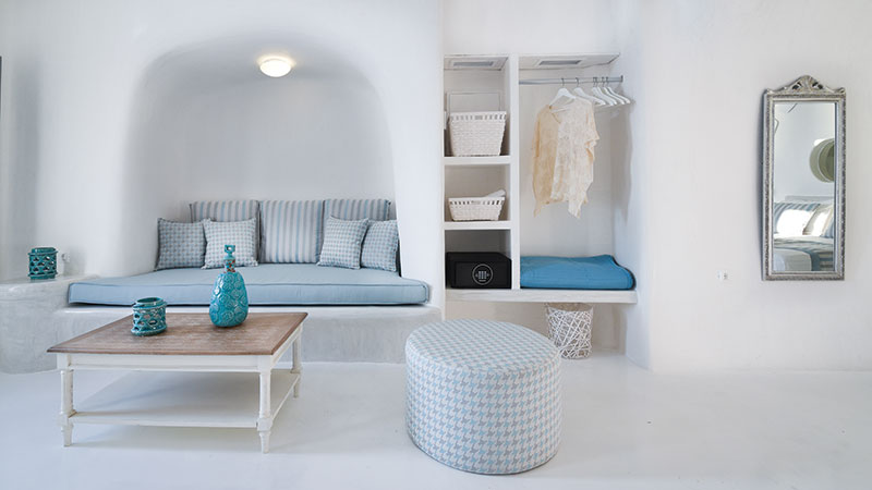 Οι 9 υπόσκαφες σουίτες κινούνται σε λευκούς τόνους με πινελιές γαλάζιου, μπεζ και γκρι, τόσο στα δάπεδα όσο και στις επιφάνειες των τοίχων και των επίπλων, με σκοπό τη δημιουργία μιας καθαρής νησιώτικης αύρας.