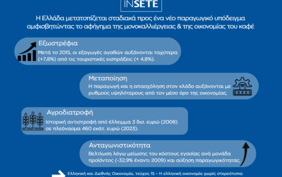 H νέα μελέτη του ΙΝΣΕΤΕ αναδεικνύει τη σταδιακή μετατόπιση της ελληνικής οικονομίας – που εξακολουθεί να χαρακτηρίζεται από σοβαρές αδυναμίες και δυσλειτουργίες – την τελευταία 10ετία προς ένα πιο εξωστρεφές παραγωγικό πρότυπο, με εξαγωγές, ανταγωνιστικότητα και μεταποίηση να ενισχύονται παράλληλα με τον τουρισμό, αμφισβητώντας με τεκμηρίωση το αφήγημα της μονοκαλλιέργειας και της «οικονομίας του καφέ».
