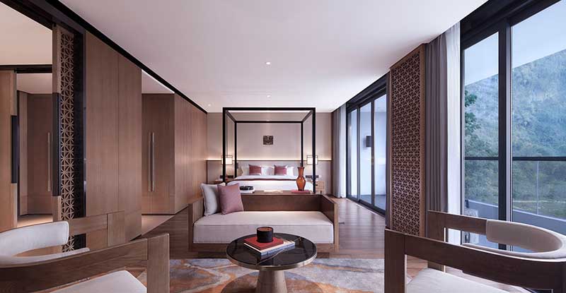 Σε κάθε ξενώνα, το μεγάλο γαλλικό παράθυρο φέρνει αρκετό φυσικό φως και οι επενδύσεις τοίχων διαθέτουν υφές, παρέχοντας μια ωραία οπτική εντύπωση. Ένα αξεσουάρ Jade είναι κρεμασμένο στο φόντο του τοίχου του κρεβατιού, το οποίο είναι εντυπωσιακό και ελκυστικό.