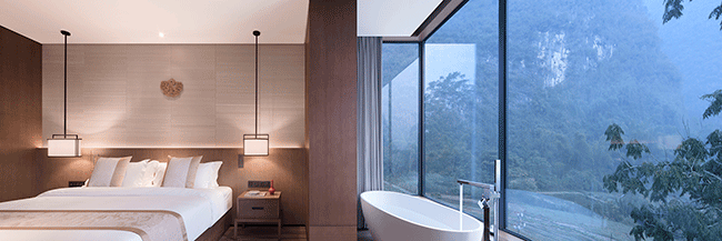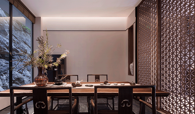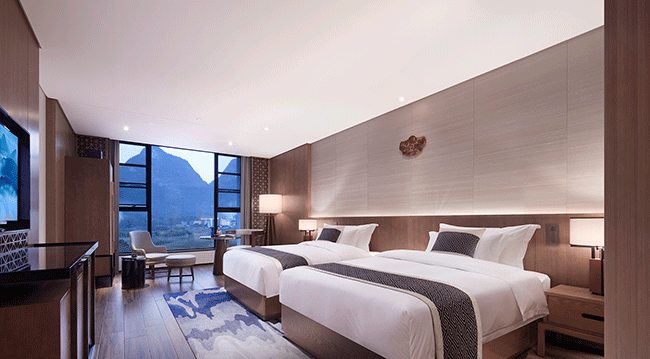 Σε κάθε ξενώνα, το μεγάλο γαλλικό παράθυρο φέρνει αρκετό φυσικό φως και οι επενδύσεις τοίχων δίνουν διαφορετικές υφές. Ένα αξεσουάρ Jade είναι κρεμασμένο στο φόντο του τοίχου του κρεβατιού, το οποίο είναι εντυπωσιακό και ελκυστικό. Το μπάνιο είναι ένας αναζωογονητικός χώρος, επιτρέποντας στους ανθρώπους να αγκαλιάζουν το ειδυλλιακό περιβάλλον και να ενσωματώνουν τόσο το σώμα όσο και το μυαλό στη φύση. Με λίγα λόγια, ο γενικός σχεδιασμός μεταφέρει την έννοια του εμπλουτισμού του πνεύματος και νου στη φύση και προσφέρει μια φανταστική εμπειρία στη φύση.