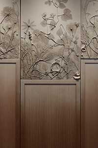 Το δωμάτιο διαθέτει τοίχους με επένδυση με σπασμένο gesso, σπασμένα μενταγιόν και τραπέζι που δημιουργήθηκε κατόπιν παραγγελίας.