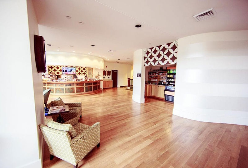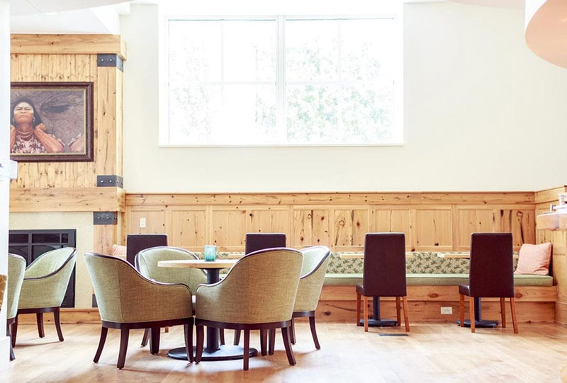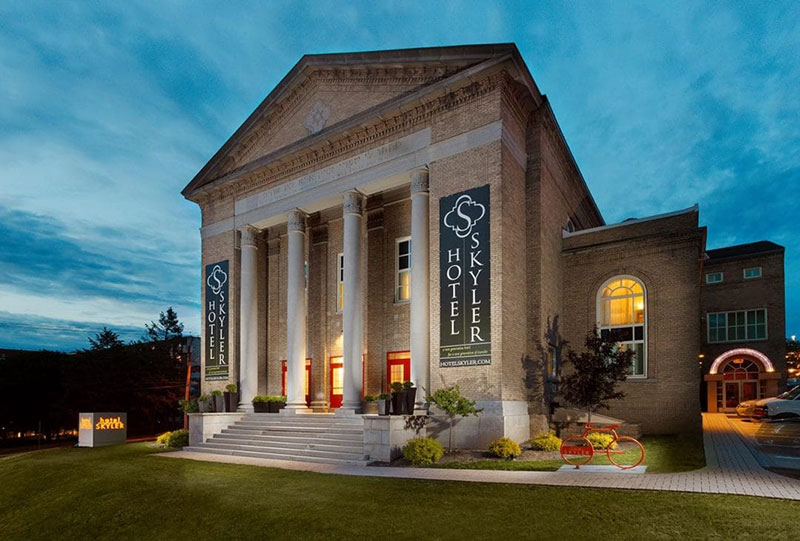Το lobby καλωσορίζει τον επισκέπτη στο βιομηχανικό μίνιμαλ κόσμο του Hotel Skyler Syracuse, που βρίσκεται δίπλα στη Πανεπιστημιούπολη του Syracuse University.