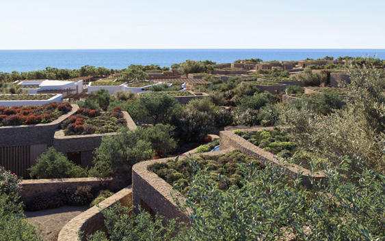 Ακολουθώντας τη γεωμετρική τυχαιότητα της γενικής διάταξης, όπως σχηματοποιείται στο ίχνος των γλυπτικών, λίθινων τοίχων κατά μήκος του δικτύου πεζοδρόμων, τα κτίρια καταλυμάτων από πέτρα και κάποια από σοβά ενσωματώνονται ισορροπημένα στους εδαφικούς κυματισμούς.  Οι προστατευμένες, μεσογειακές αυλές τους ανοίγονται προς τη θέα αποτελώντας συνέχεια των εσωτερικών χώρων, το «μέσα» με το «έξω» ενοποιείται.  Πέργκολες και στοιχεία σκιασμού από ακατέργαστο ξύλο και πλεκτές, ψάθινες φολίδες  συμπληρώνουν τους κτιριακούς όγκους παρέχοντας μία φυσική αίσθηση.  Η λεπτότεχνη κατασκευή τους παραπέμπει σε παραδοσιακές τεχνικές.